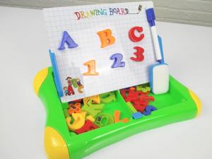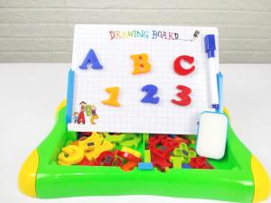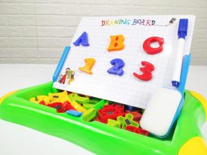 Papan tulis 2 fungsi untuk belajar mengenal, membaca, dan menulis huruf. Papan bisa ditulis menggunakan spidol, bisa juga di tempel huruf magnet. Posisi papan bisa di berdirikan, bisa juga tidur.