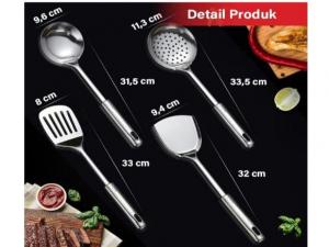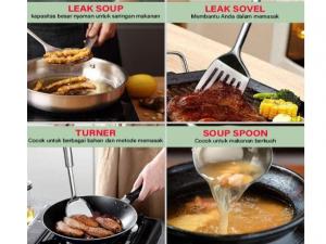 Material : FDA approved Stainless Steel, Keunggulan lain bahan ini adalah anti karatnya yang tahan lama. Keseluruhan set spatula ini hadir dalam bahan stainless steel berkualitas mulai dari ujung gagang hingga bagian penyendoknya.